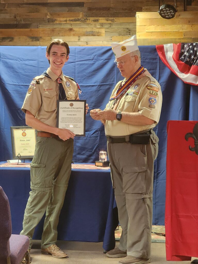 Tommy safely pulled over and immediately assessed the situation. Another passerby stopped to help, but Tommy quickly took charge, directing someone to call 911. Seeing the overturned vehicle leaking fluids and emitting smoke, Tommy approached and managed to bend open the pinned passenger-side door to reach the elderly occupant trapped upside down by his seatbelt. Using the skills he had learned in Scouting, Tommy unbuckled the man and helped him out of the vehicle to safety.