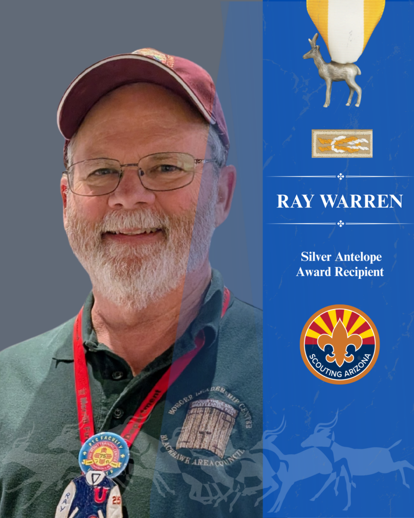 Ray says receiving the Silver Antelope Award is difficult to put into words because recognition has never been his motivation. His service comes from a deep belief in Scouting and the value it brings to society. He is grateful to those who nominated him and honored to be recognized among the many volunteers who work to help shape future leaders through the values of the Scout Oath and Law.